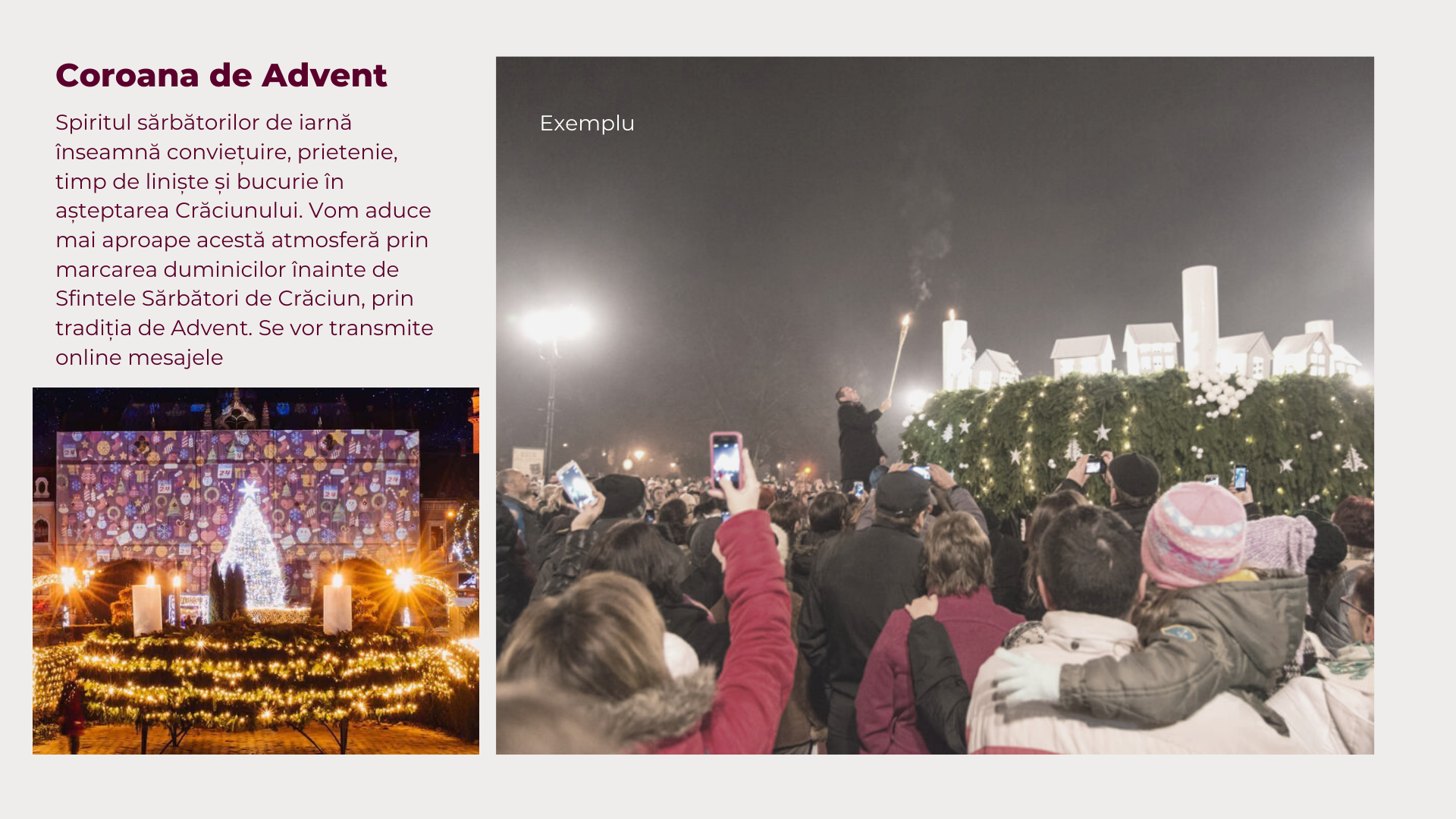 Pe platoul din centrul parcului va fi amplasată și coroana de Advent, prin care se vor marca duminicile înainte de Sfintele Sărbători de Crăciun, în speranța că locuitorii vor simți momentele speciale de apropiere a sărbătorilor. Prima lumânare din coroana de Advent se va aprinde pe 26 noiembrie.
