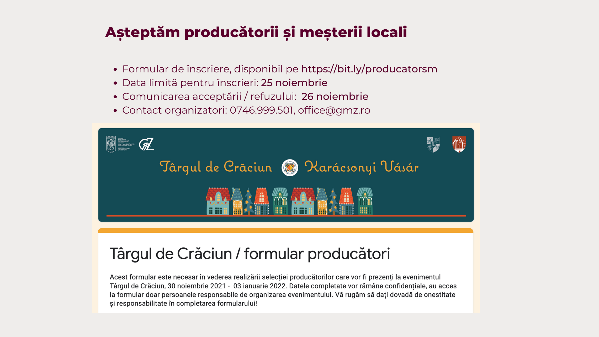 Până în 25 noiembrie, producătorii care doresc să aducă produse la căsuțele din Parcul Libertății, sunt rugați să completeze formularul în baza căruia se va face selecția, pe care îl găsesc la următorul link: https://bit.ly/producatorsm . Și în acest an, Primăria va da prioritate producătorilor sătmăreni.