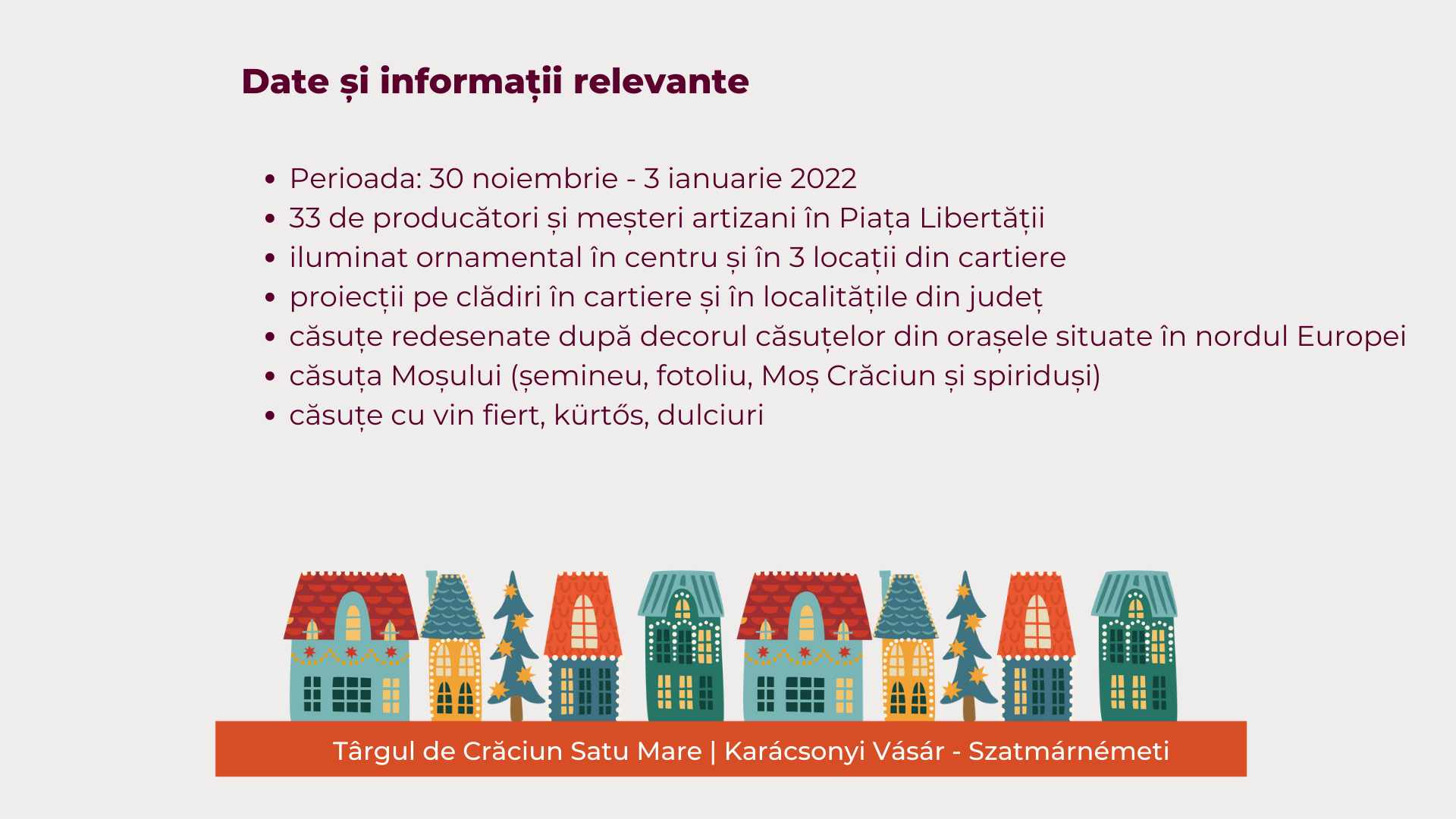 Organizatorii Târgului de Crăciun sunt: Primăria Municipiului Satu Mare, Consiliul Județean Satu Mare, Centrul Cultural G.M. Zamfirescu, Centrul Județean pentru Conservarea și Promovarea Culturii Tradiționale Satu Mare. Târgul de Crăciun se va închide pe 3 ianuarie 2022.