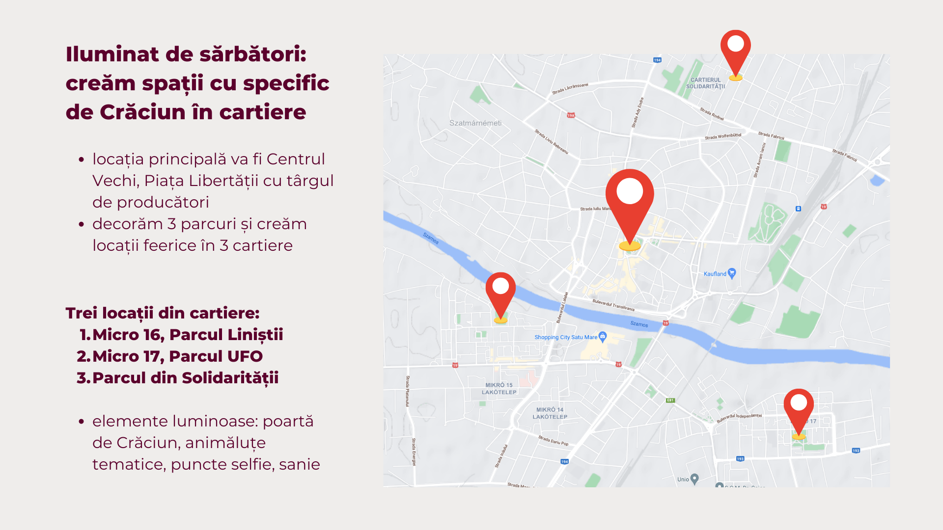 Ca o noutate, în acest an, Primăria a ales trei locații, din trei cartiere diferite, care urmează să fie decorate cu lumini și elemente decorative specifice. Acestea sunt: