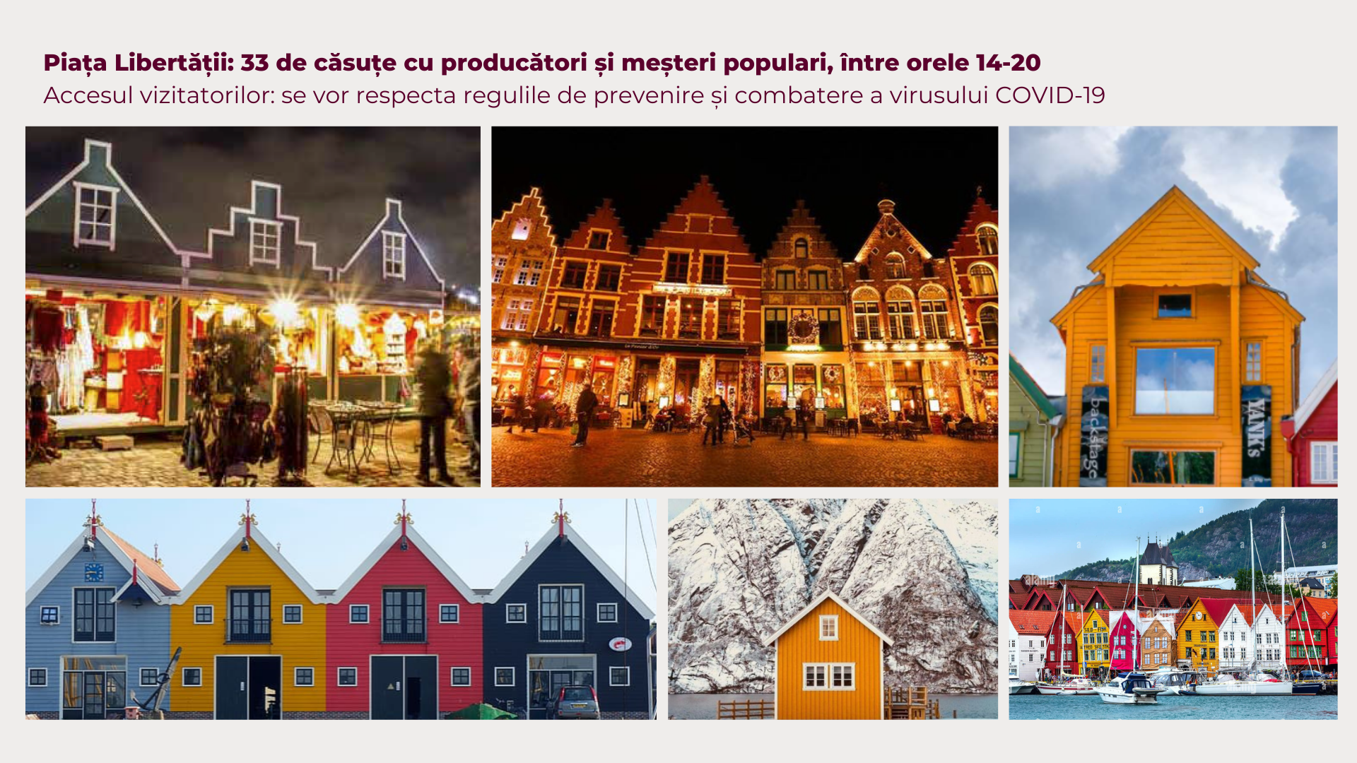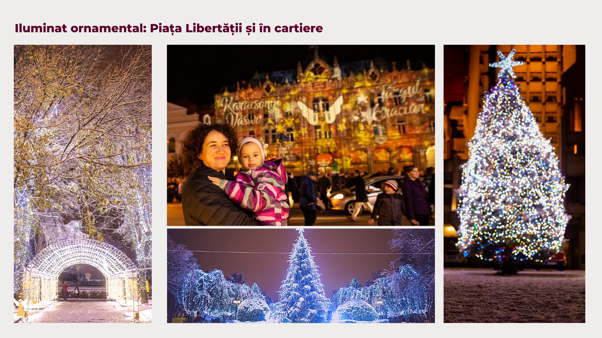 Centrul istoric, străzile adiacente și copacii din parcul central se vor umple de luminițe, iar toată atmosfera feerică va fi completată de figurinele luminoase: reni, oameni de zăpadă, ursuleți și un tunel de lumini. Culorile predominante vor fi roșu și alb cald.