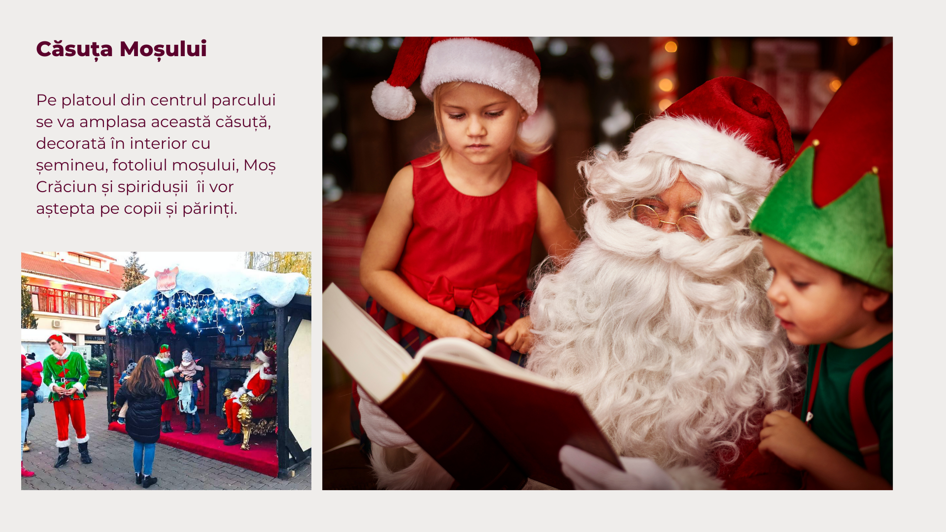 În acest an, Moș Crăciun ajunge și el la târg. Căsuța lui din centrul parcului va fi decorată festiv, iar Moș Crăciun și spiridușii lui îi vor aștepta pe cei mici și mari pentru a prelua scrisorile și pentru fotografii.