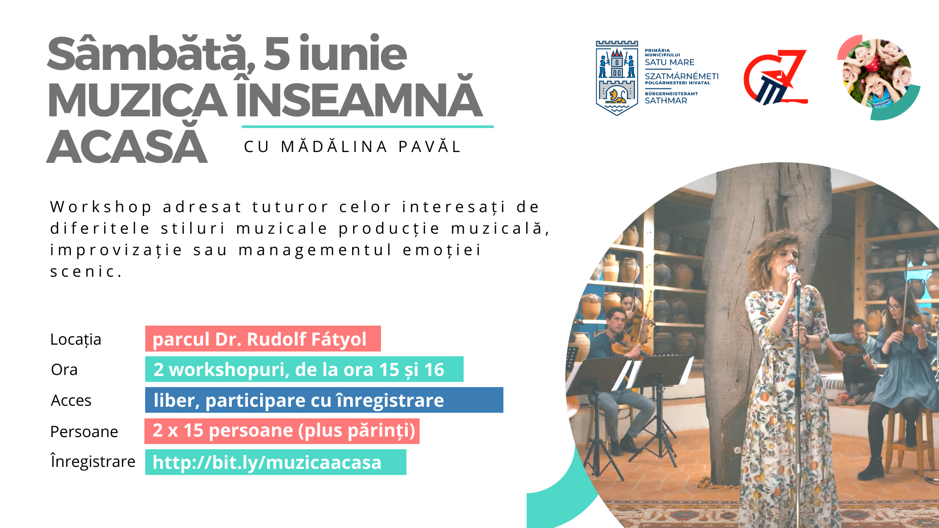 Duminică, 6 iunie, de la ora 20.00 va avea loc concertul pregătit de Mădălina Pavăl (voce) - Raluca Stratulat (vioară), Eliza Puchianu (pian). Locația: Parcul Dr. Fátyol Rudolf, în jurul Turnului Pompierilor. Intrarea se face în baza biletelor rezervate, care sunt disponibile GRATUIT, exclusiv pe platforma bilete.ro, în limita a 300 de bilete pentru concert.