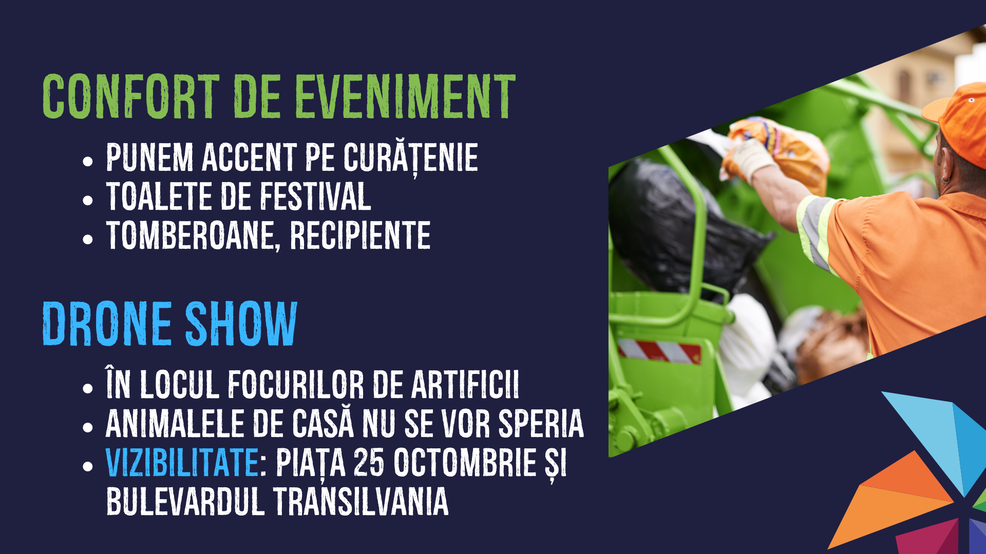 Pentru deșeuri se vor amplasa mai multe tomberoane și containere, iar în toata zona evenimentului vor fi amplasate toalete ecologice moderne, de tip container.