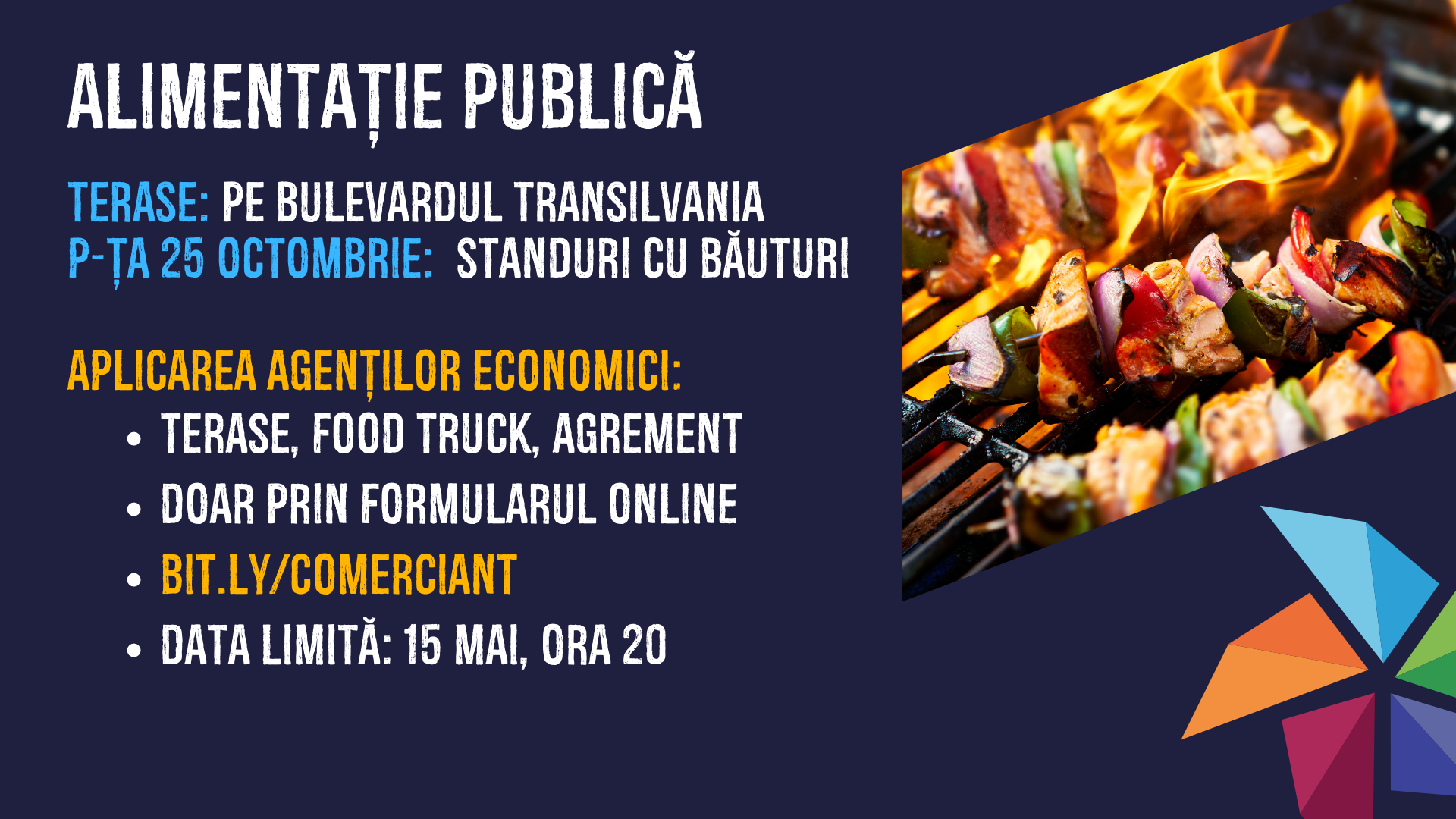 Din punct de vedere organizatoric, privind punctele de alimentație publică, am decis amplasarea teraselor pe bulevardul Transilvania, iar pe platoul din Centrul Nou se va permite doar comercializarea băuturilor. Comercianții vor fi selectați în funcție de experiența pe care o au la alte evenimente și festivaluri mai mari și în funcție de aspectul estetic al standului propus. Depunerea cererilor și propunerilor se poate face prin completarea următorului formular: bit.ly/comerciant iar aceasta este singura posibilitate de a-i contacta pe organizatori.