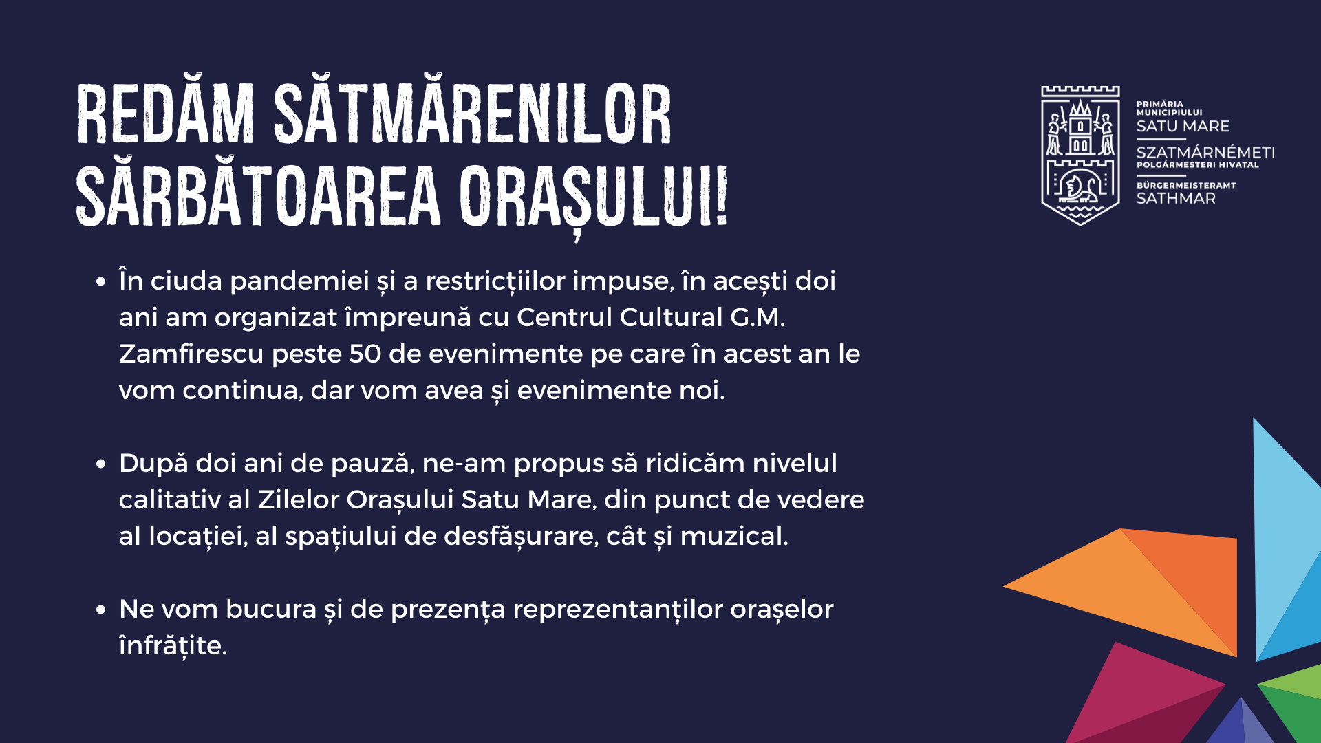 Zilele Orașului Satu Mare este cel mai mare eveniment din viața comunității noastre, având o tradiție de peste 20 de ani. După doi ani de pauză, dorim să ridicăm nivelul calitativ al evenimentului, atât pe plan artistic, cât și muzical. Dorim să redăm sătmărenilor bucuria și spiritul acestei sărbătorii care a eclipsat mulți ani evenimente similare din întreaga Românie.