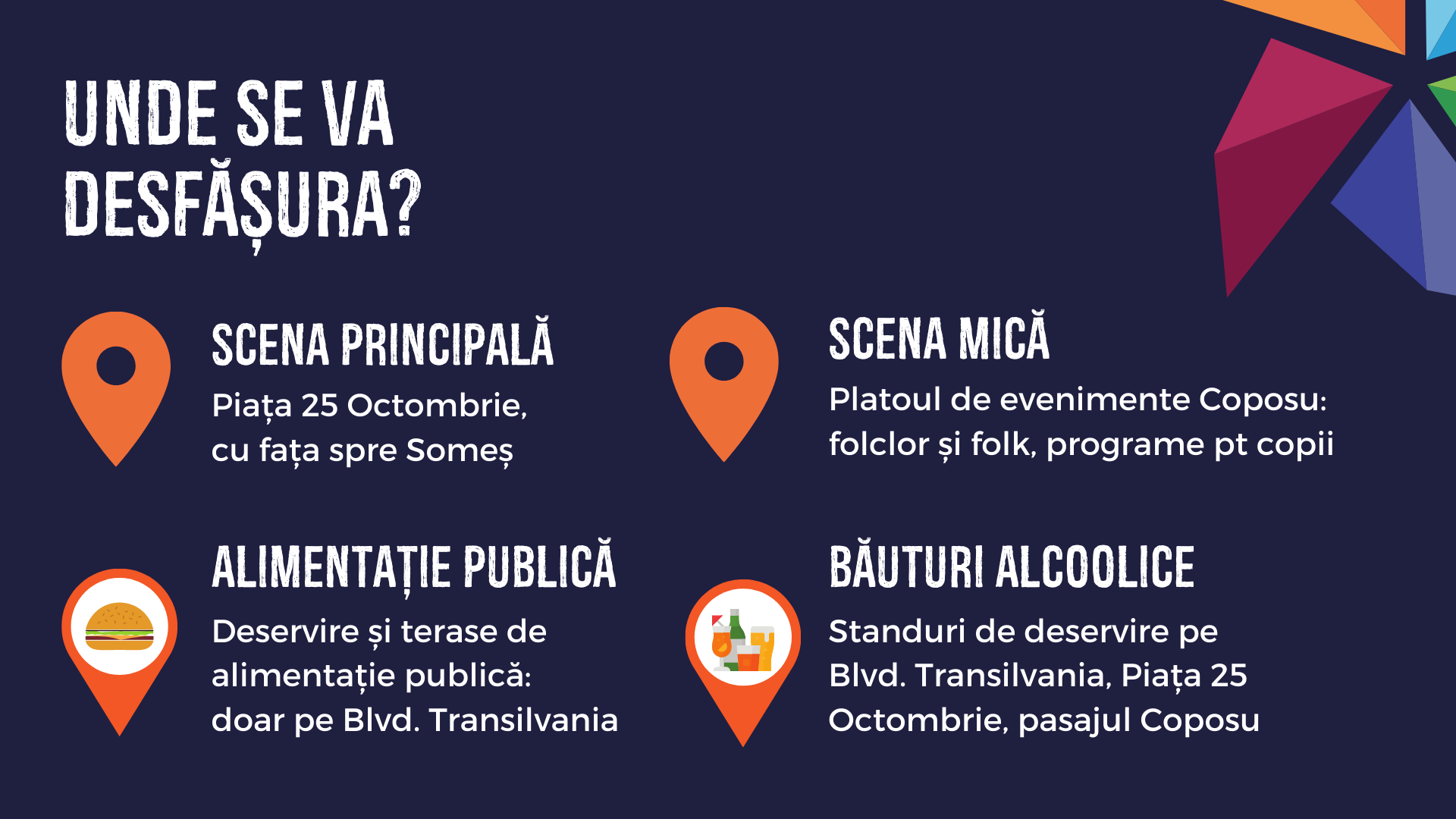 Locația: Evenimentul va avea loc în Centrul Nou al orașului, Piața Libertății fiind închisă parțial unde vor demara lucrările de reabilitare. Scena mare se va amplasa în Piața 25 Octombrie, iar scena dedicată copiilor și programului de muzică folclor se va amplasa pe platoul de evenimente de pe Pasajul Corneliu Coposu.